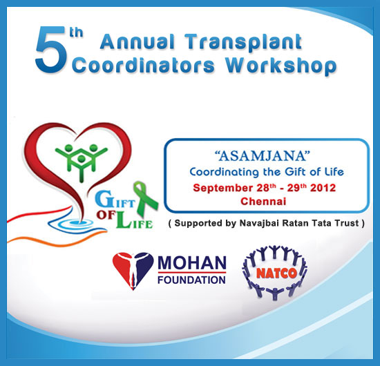 As part of mentoring, the 3rd Annual Transplant Coordinators Workshop “Asamjana – Coordinating the Gift of Life!” is being organized on September 28th & 29th 2012 in Chennai.